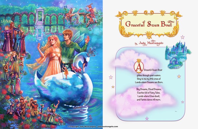 Being an illustrator/artist, plus an author, I often begin a creation with an image that appears in my imagination. I call it a “Mind Painting”. This little poem came to me along with the Fairy image, with its lyrical song-like verse. The rhythm of the words seemed to go along with the gentle rocking of the Fairy Swan Boat as it floated down a magical stream in Fairyland.
