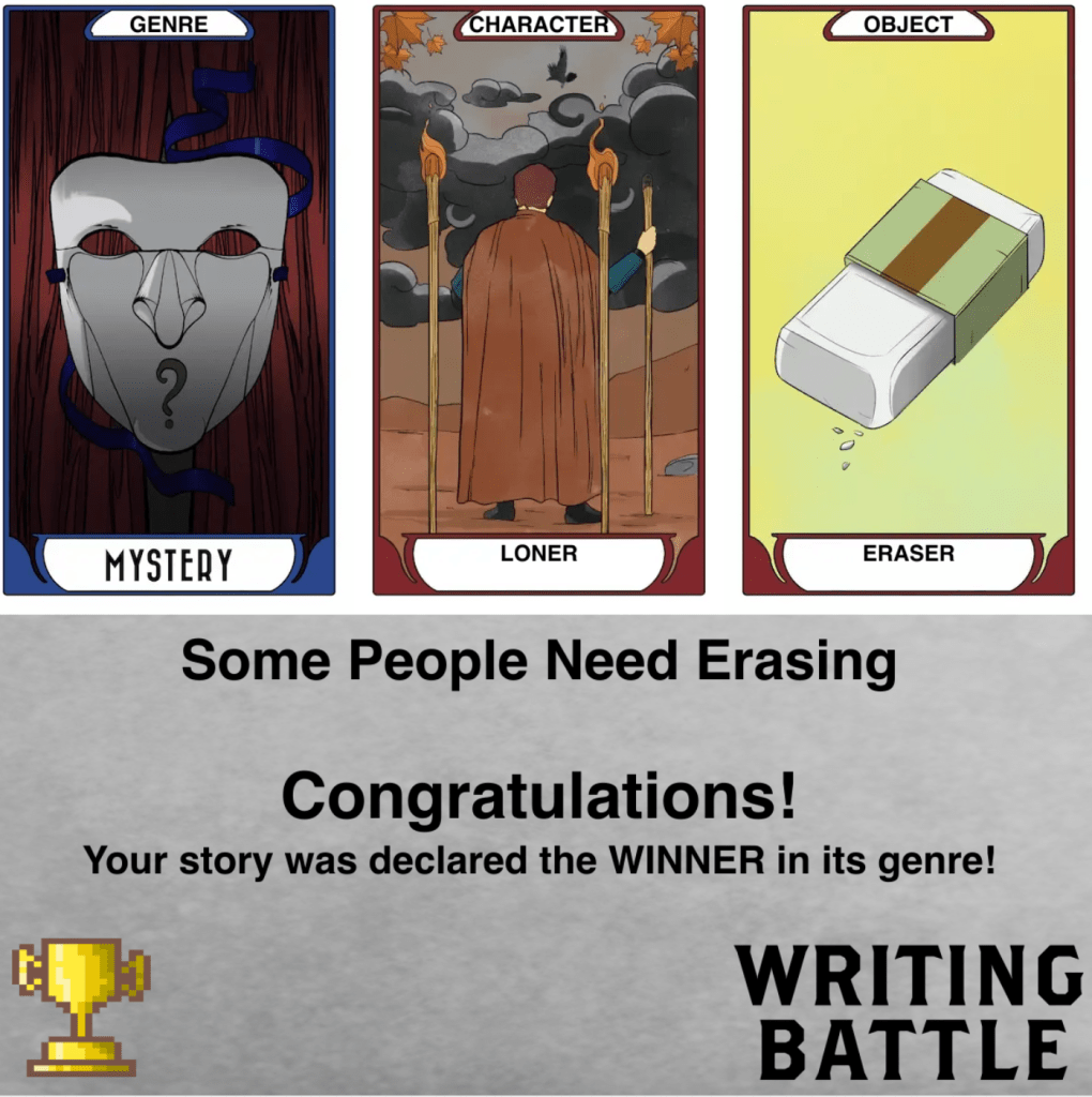 If you haven’t yet, go check out my story at the Writing Battle winner’s page. And if you’re a writer, consider joining WritingBattle.com. It’s a blast!