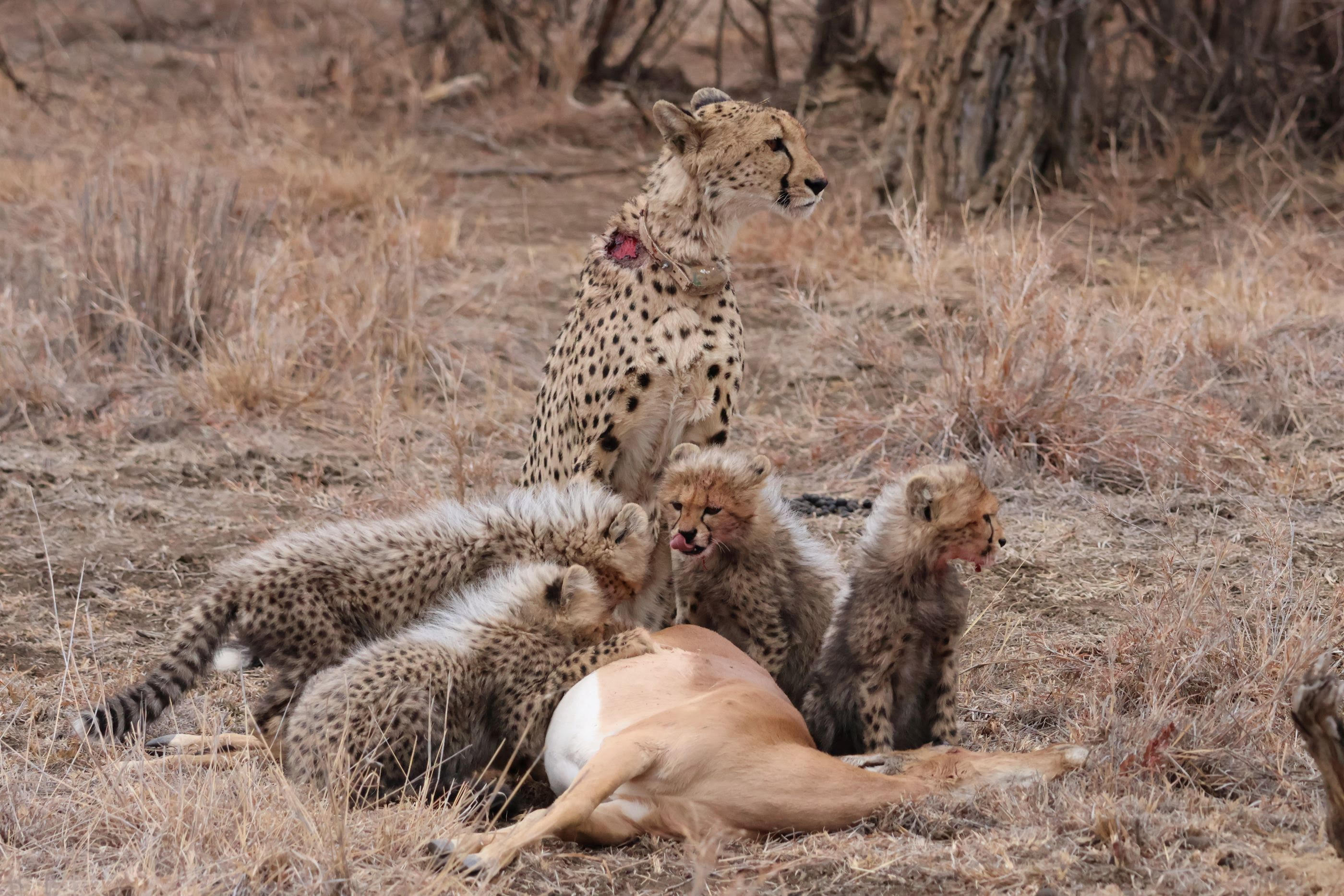 Five feeding cheetahs