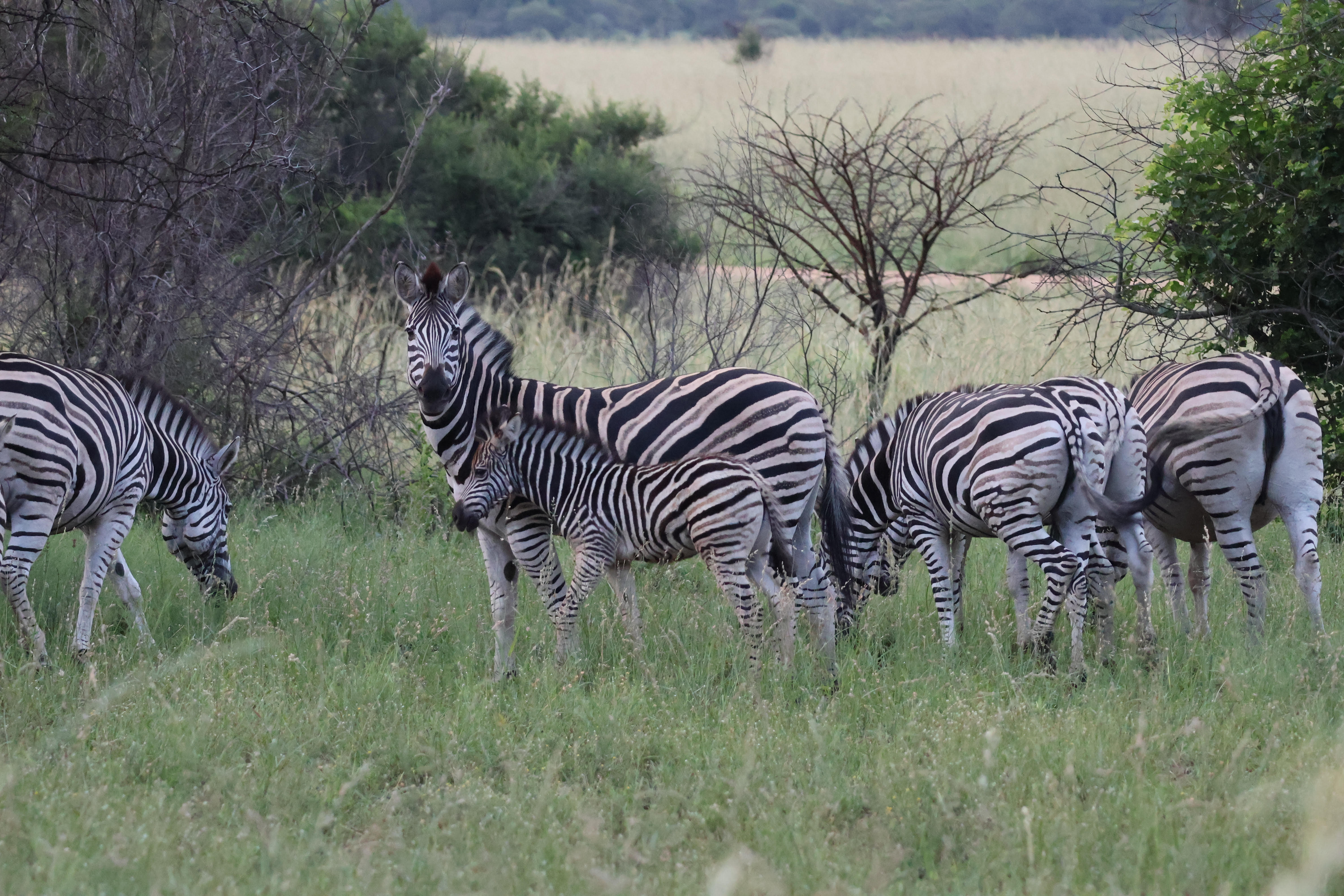 Six grazing zebras