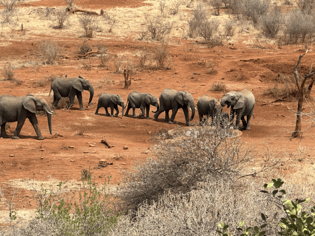 Seven marching elephants