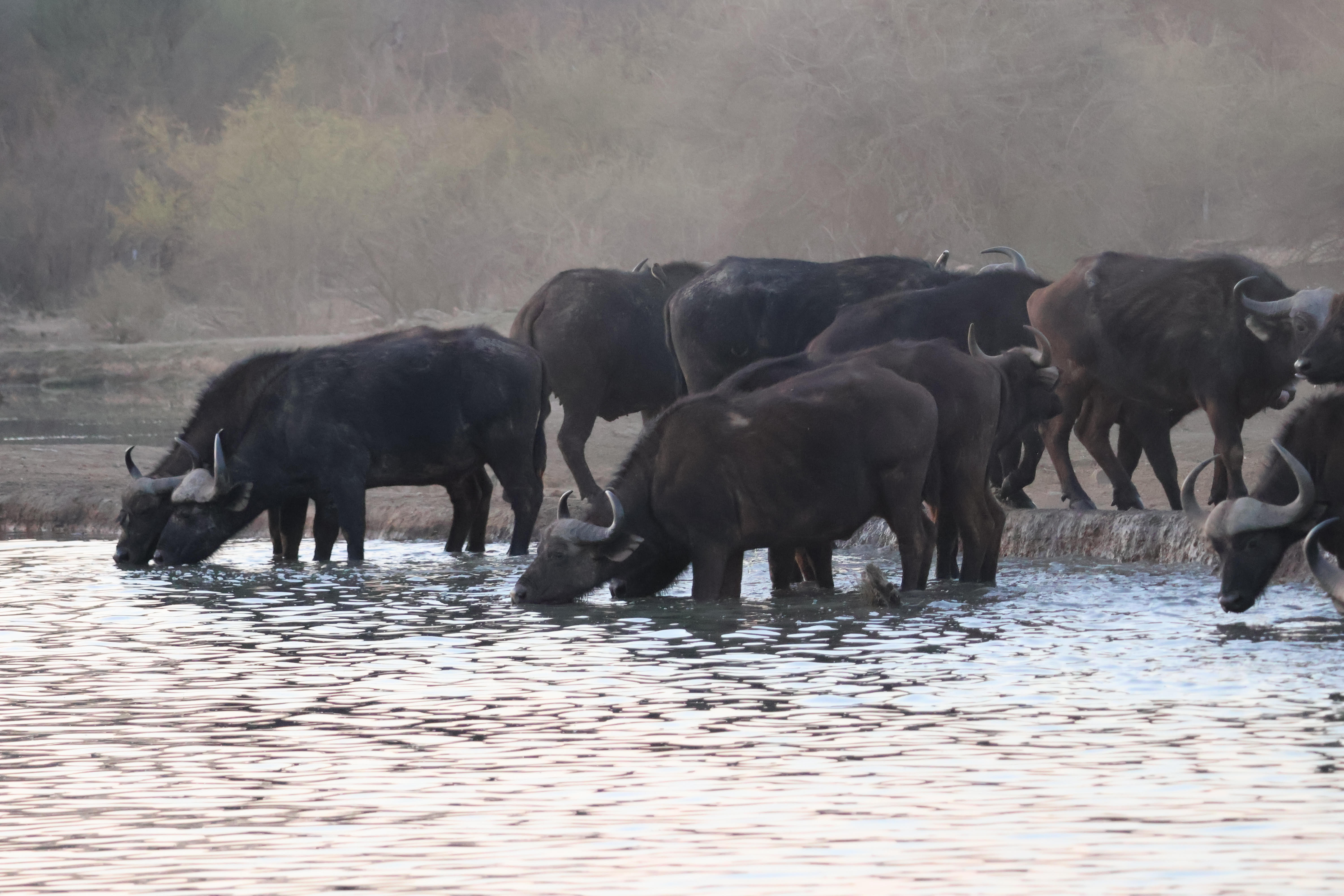Eleven buffalos drinking