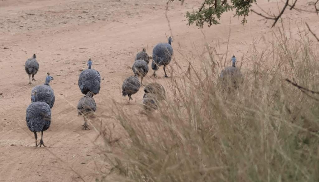 Twelve guinea fowl running