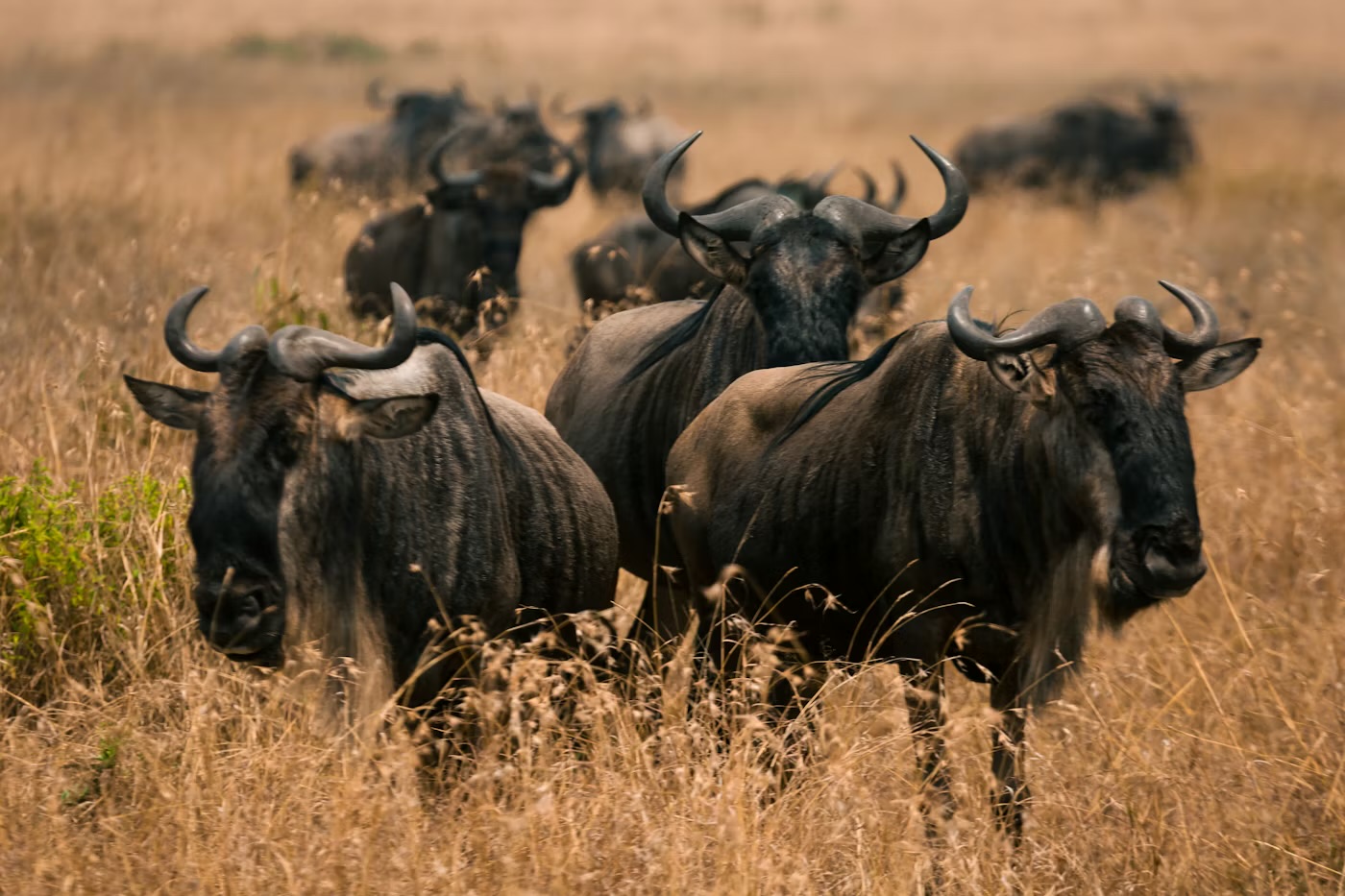 Nine wildebeest prancing