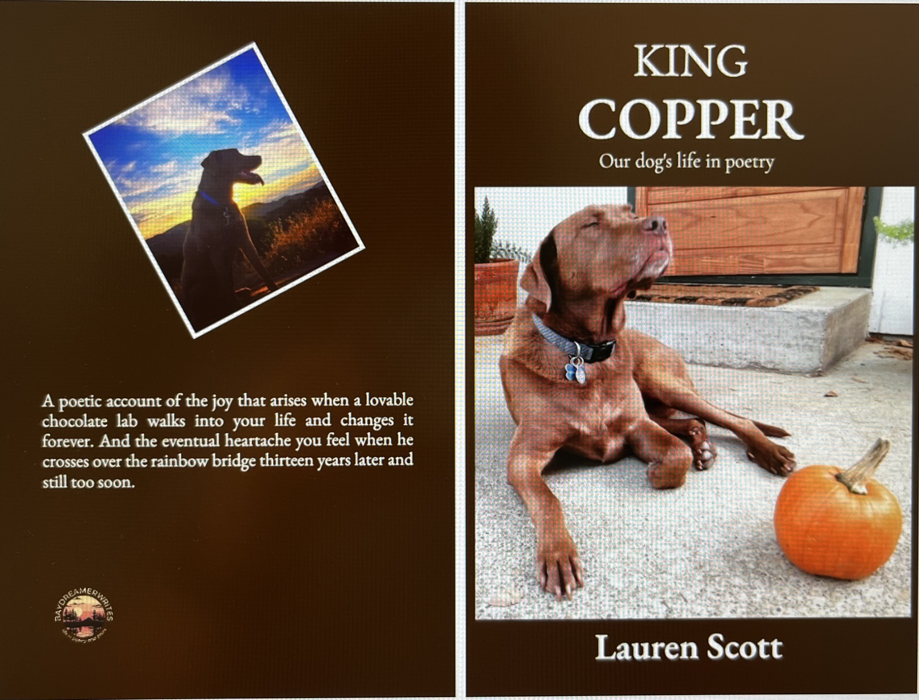 Copper was our first dog where we had to make that heartbreaking decision of life or death, and it was beyond painful. We did the right thing for the right reasons, but second guessing came naturally. He was 14 ½ years old and had other health issues, so when his health took a turn for the worse on March 3, 2025, taking away his suffering was the human thing to do. The events of that Monday morning are still vivid and roll through my mind in slow motion. The grief was so intense I began writing poetry. I gave my heartache a place to live in my poems, and with my previous fun poetry about Copper, a collection evolved. This was my first unplanned book – a loving tribute to our senior pup who we still miss even after a year since he received his angel wings. I have to add that all of our dogs were special; there are no favorites. But when Copper passed, I was in a different stage of life where I had time to work on King Copper. And all of our beloved canine family members have their place in a poem because Copper has met them across the Rainbow Bridge.