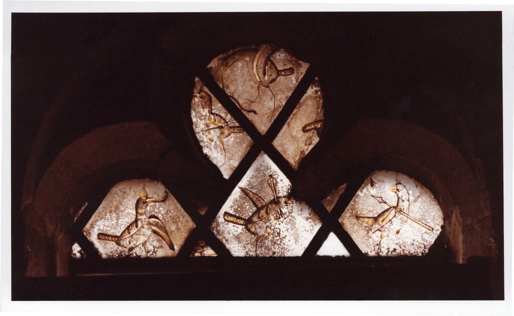 A 15th century stained glass window in Buckland Rectory, Gloucestershire depicts the death of a robin by an arrow.