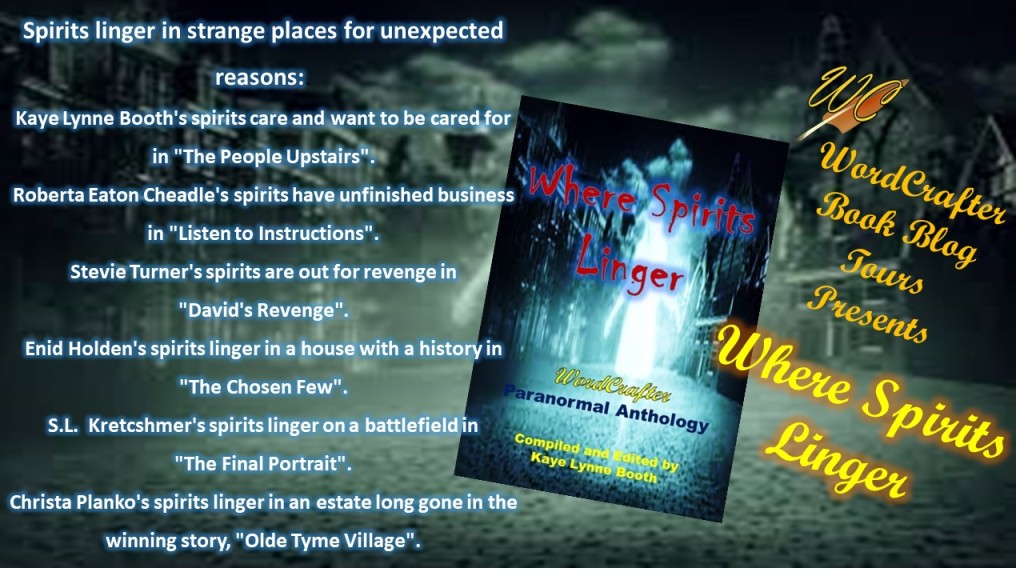 Posted: September 25, 2021 | Author: kayelynnebooth | Filed under: Blog Tour, Book Promotion, Books, Ghost Stories, Giveaways, Paranormal, Stories, WordCrafter Book Blog Tours, WordCrafter Press | Tags: Christa Planko, Enid Holden, Ghost Stories, Kaye Lynne Booth, Paranormal, Roberta Eaton Cheadle, S.L. Kretschmer, Short Fiction, Short Stories, Stevie Turner, Where Spirits Linger, WordCrafter Book Blog Tours, WordCrafter Press | 2 Comments
