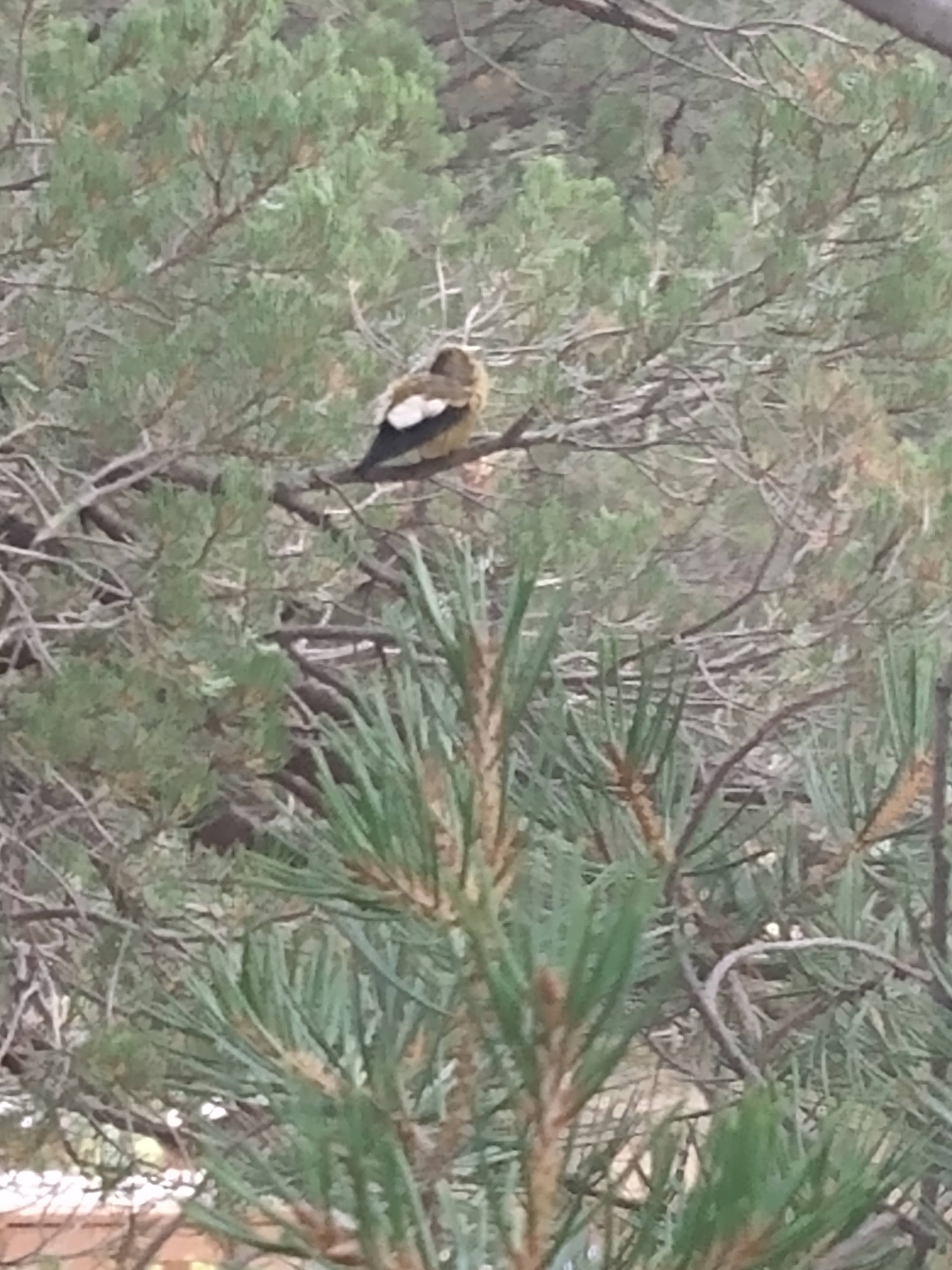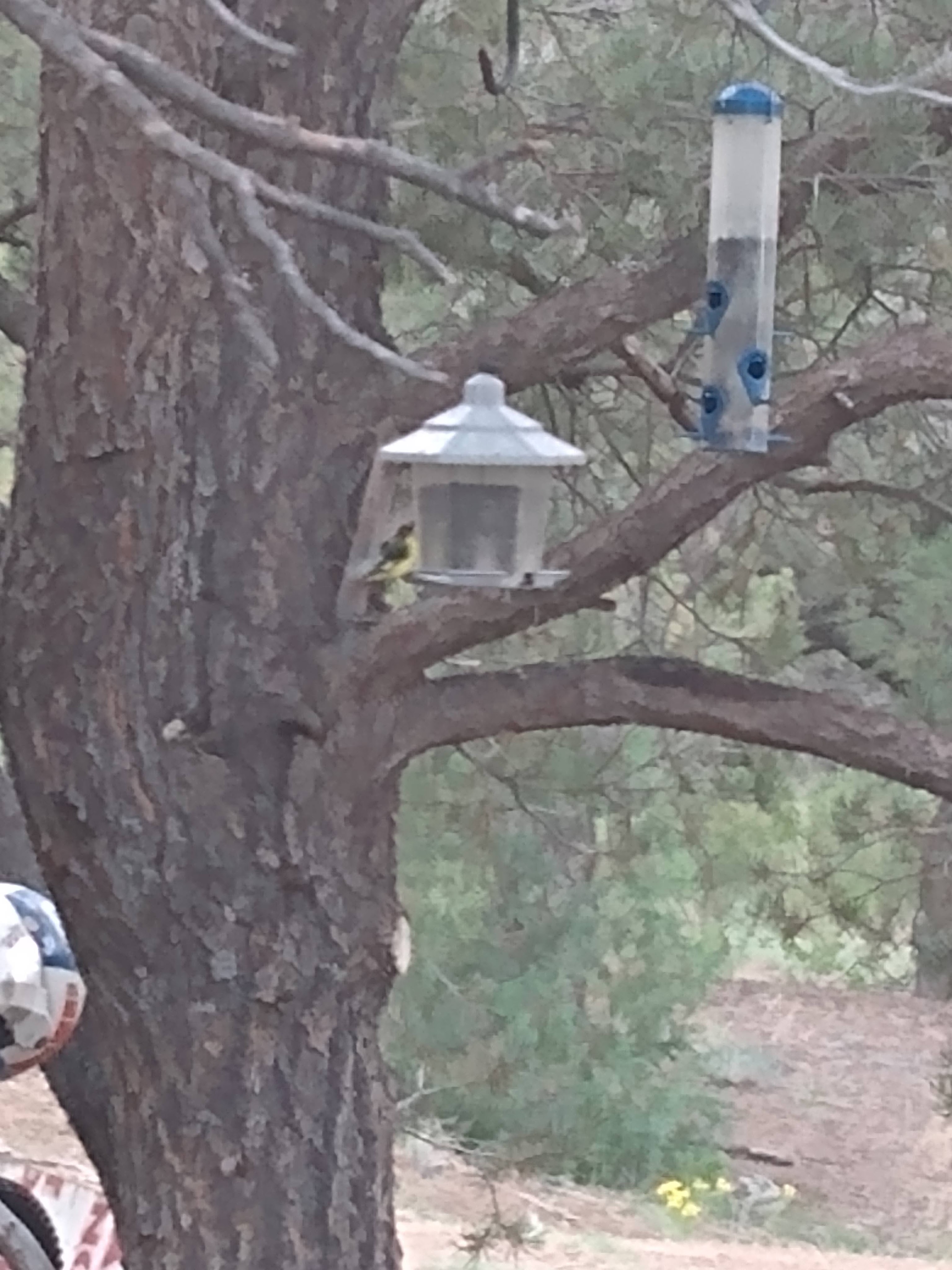 This year, I have a single baby grosbeak that hangs out in my coal box, which is just to the side of the feeder area, and comes out all alone to get seed each day. I don’t know what happened to its parents, but it seems to be an orphan.