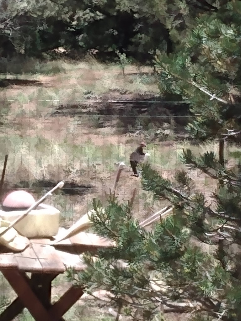 - In the first picture below you see both a woodpecker and a Cassin’s Finch. Woodpeckers often hang on the bottom of the feeder as their size makes perching difficult. They also hang from the hummingbird feeders, not for the nectar, but for the ants that it attracts. The Cassin’s Finch always look to me like someone splashed red paint over their heads, a glimpse of bright red or pink in a sea of green pine boughs.