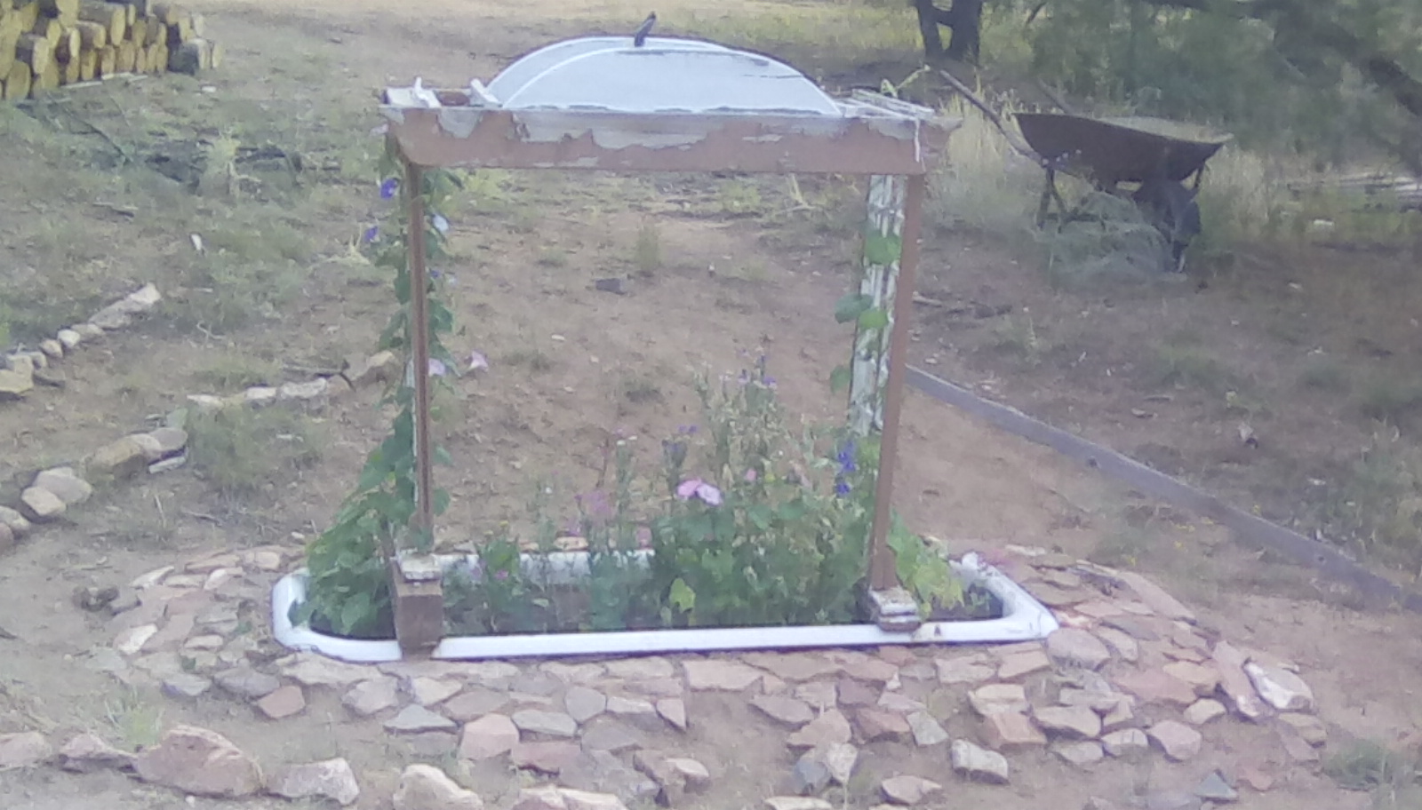 It began when I buried a cut-off water tank with the idea of creating a water garden. Then, I buried an old bathtub in the gully running down to the ‘water garden’ and bolted a trellis over it. That first year, I planted mixed flower seeds and Morning Glories to grow up the trellis. I began placing flat rocks around the edges of the bathtub to create an area where I could sit and maintainence the flowers planted in the bathtub easily.