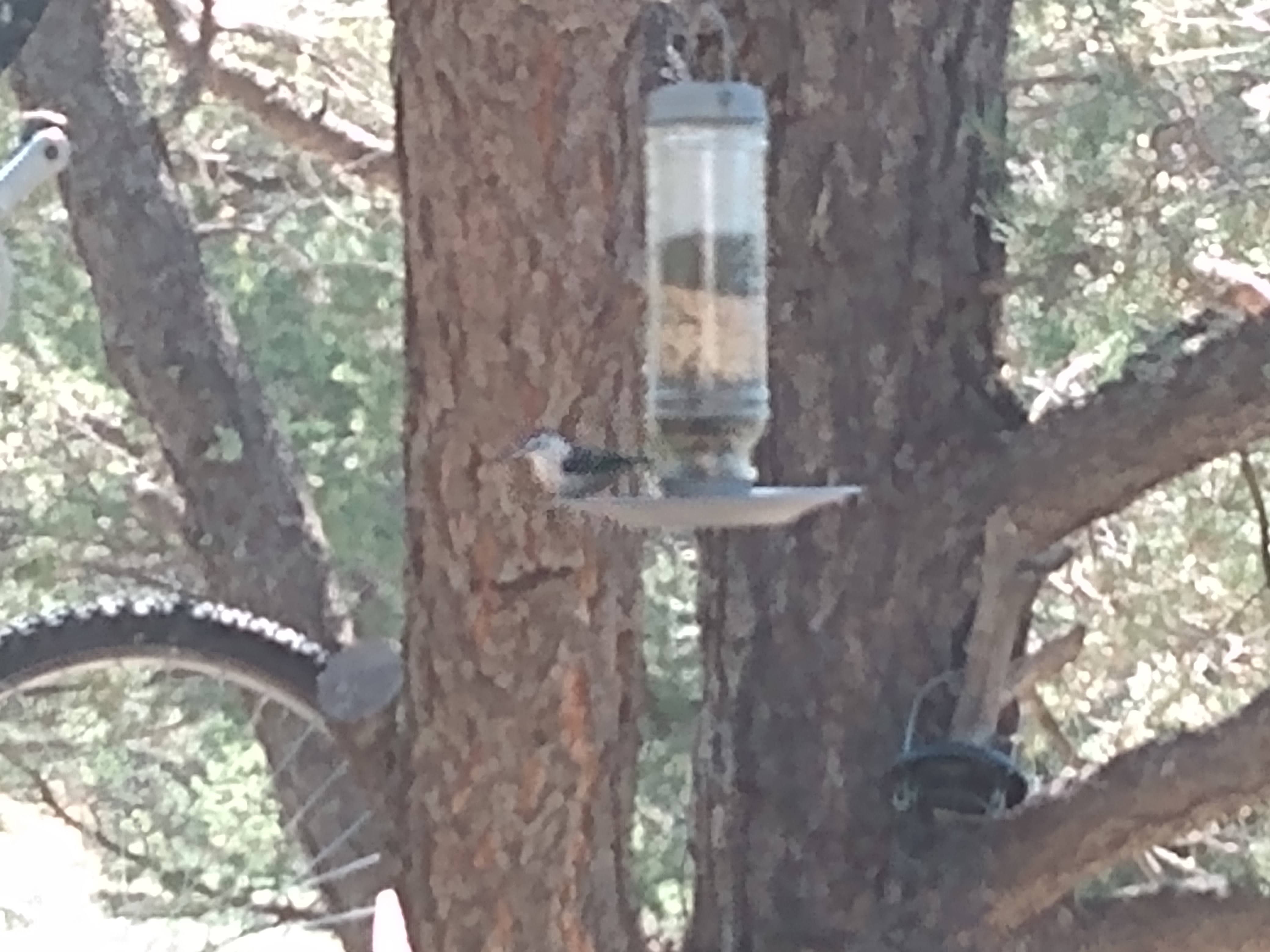 - In the first picture below you see both a woodpecker and a Cassin’s Finch. Woodpeckers often hang on the bottom of the feeder as their size makes perching difficult. They also hang from the hummingbird feeders, not for the nectar, but for the ants that it attracts. The Cassin’s Finch always look to me like someone splashed red paint over their heads, a glimpse of bright red or pink in a sea of green pine boughs.