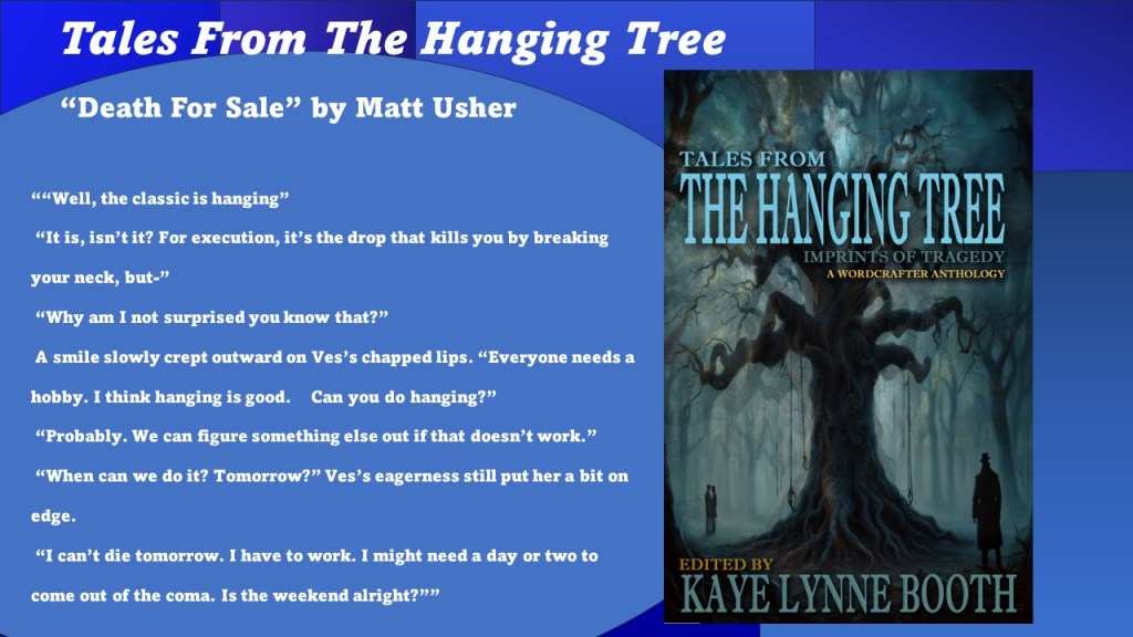 That wraps up this stop and the WordCrafter Tales From the Hanging Tree Book Blog Tour. Thank you all for hanging around with us, and thanks to the contributors of the anthology for all their promotional efforts for this tour. Be sure to use the schedule above to go back and visit any stops that you missed, and don’t forget to comment so I know you were there and can enter you in the drawing for the giveaway. I’ll leave this open through the weekend and announce the winners in this month’s “WordCrafter News” on Monday, the 30th, so be watching for that. After all, you might be a winner!