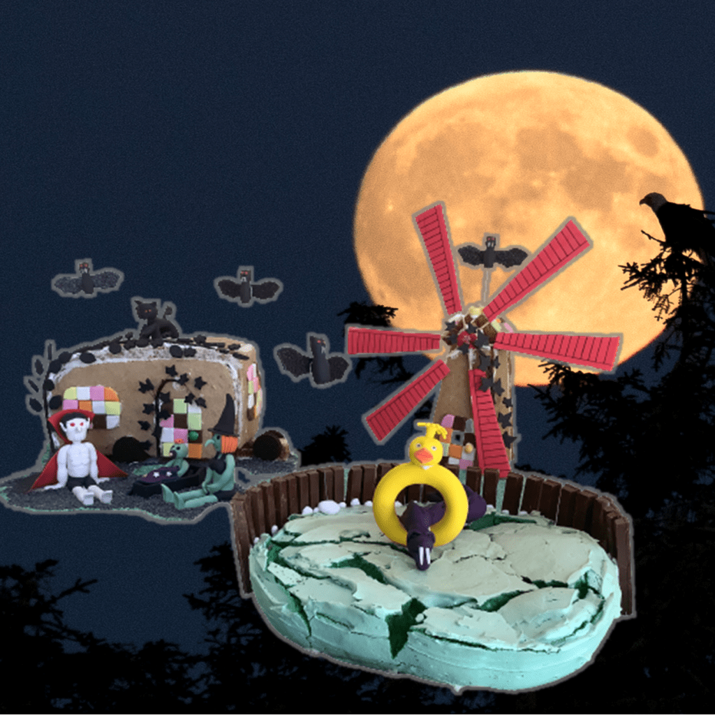 The gingerbread caravan that features in Haunted Halloween Holiday was difficult to make because I had to bend the gingerbread to make it harden in a curved shape. I did have to make adaptions to my initial plan and I created the sides and top of the caravan in two parts instead of one as I’d originally planned. I did have to redo that piece of gingerbread. You have to bend it while it is still hot but not so hot it collapses (or burns you) but before it starts to harden or it cracks. Another tricky timing situation.